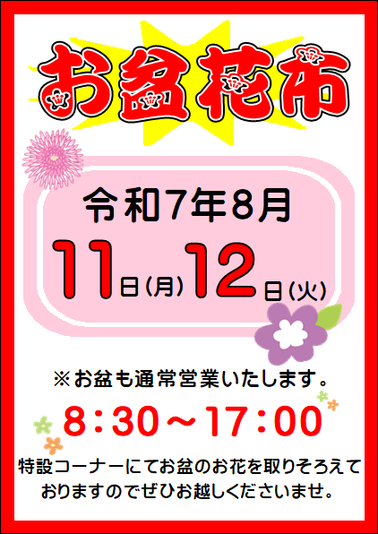 令和7年8月11日、12日は花市を開催いたします。特設コーナーにてお盆のお花を取り揃えております。また、お土産やギフトも取り扱っておりますのでぜひ道の駅にしねにお越しください!※お盆も通常営業いたします。(8:30~17:00)