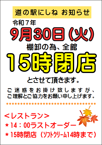 いつも道の駅にしねをご利用いただきまして 誠にありがとうございます。令和7年9月30日(火)は棚卸の為、全館15時閉店となります。(レストラン:14時ラストオーダー、ソフトクリームは14時まで)ご迷惑をお掛け致しますが、ご理解とご協力をお願い申し上げます。