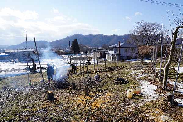 2月の後半となりました。厳しい寒波が続いていましたが、今週から日中の気温がプラスになっています。雪も少ないのですがりんご園地では土が表れています。りんごの品種を更新するために古いりんご樹を伐採しています。春に伐根して新品種を植え付けていきます。