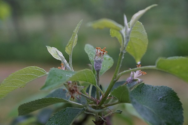 5月21日雨。晴天が続いていましたが、今朝は雨になりました。果樹園には良い水分補給となりました。りんごの満開から落花して中心花から果実になってきています。これから摘花から摘果の作業が始まります。