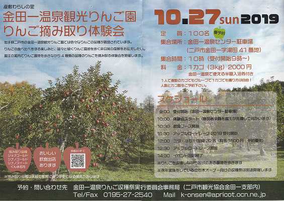10月27日(日)、金田一温泉観光りんご園りんご摘み取り体験会が行われます。金田一温泉センター駐車場に午前9時から受付を開始し、10時集合です。料金は1カゴ(3kg)2000円金田一温泉で使える半額入浴券付き。10時体験会スタート(参加者全員を園主が先導して4カ所の園地を案内します。品種は園地毎にジョナゴールド、シナノゴールド、シナノスイート、ぐんま名月の4種類です。11時30分アップロードレース2019受付開始。12時30分アップルロードレーススタート。14時30分イベント出店終了。