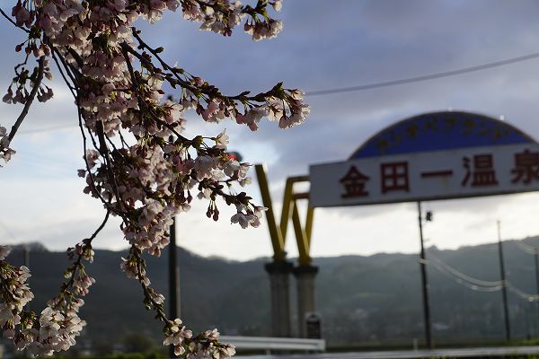 23日(木)曇り。今朝もまだ雨が時折降る寒い気温になっています。金田一温泉入り口のアーケードがある金田一コミュニティーセンターの桜が咲いています。一昨日辺りから蕾が開き始めました。これからいっぱい開花していきます。