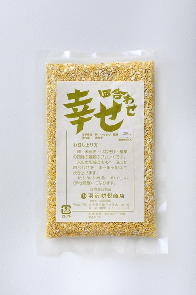 この商品名 幸せは、四合わせの米粒麦・いなきび・糯粟(もちあわ)・精ひえの雑穀ブレンドです。