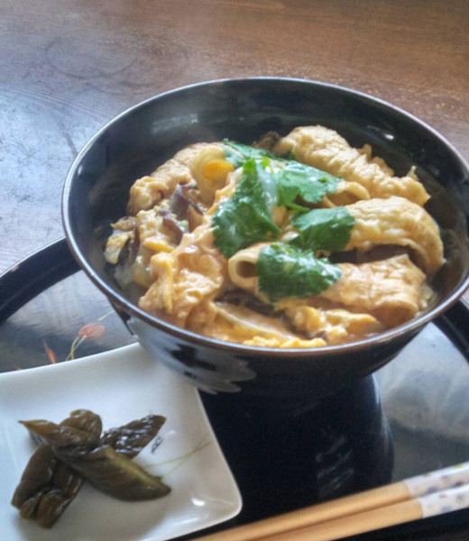 (6) 玉子が半熟で火を止め、もうひと蒸しし丼に入れたご飯の上に盛り付ける。