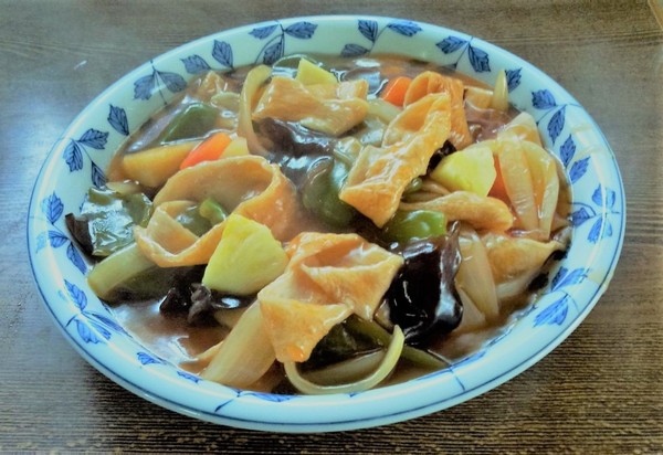 (6) (5)に人参 竹の子 きくらげを加えひと煮し、最後に切り板麩 、ピーマンを加え水溶き片栗粉でトロミを付