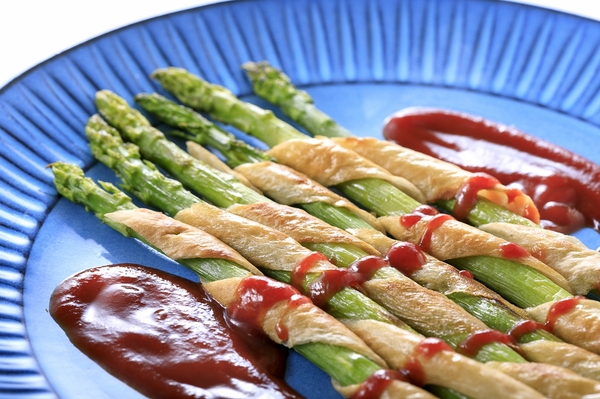 (4)グリーンアスパラガスに (3) を巻きつけ、端を爪楊枝でとめる。